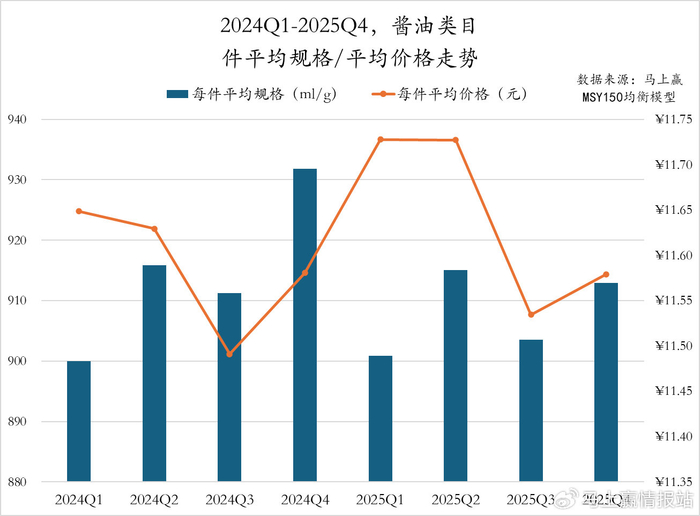 2024Q1至2025Q4,酱油类目件均规格在2024Q4大幅提升至930ml/pcs以上,其余季度在900ml-920ml/pcs之间波动变化。件均价格方面,2024/2025两年的Q3均为件均价低点,2025年Q1、Q2同比2024年则有着较为显著的价格提升,2025Q3、Q4的件均价也均略高于2024年同期。