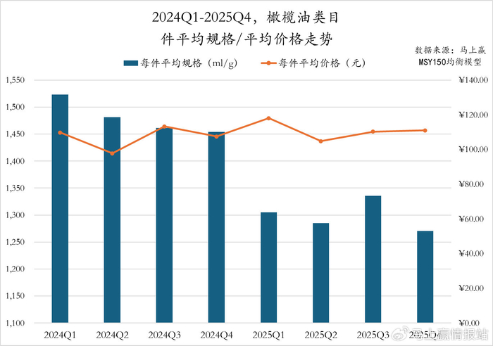 2024Q1至2025Q4,橄榄油类目呈现出”规格断崖式下滑,价格基本稳定“的走势。件均规格在2024年各季度中就已经呈现出小幅下滑的趋势,但从2024Q4至2025Q1则迎来了一次显著的件均规格下滑,或与套组组合方式/组合习惯的创新与变化有一定对的相关性;相比来说,橄榄油类目的件均价则基本维持在100-120元/pcs区间,甚至在2025相比2024年还有一定的提升,在类目高增长的背景下,未来或也将有更多形态的产品、组合方式等加入到竞争到中,重新定义市场接受的产品形态与方式,这一发展值得持续关注。