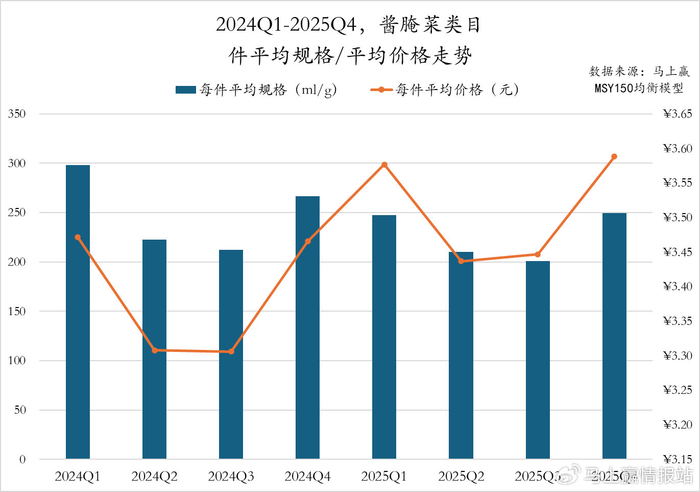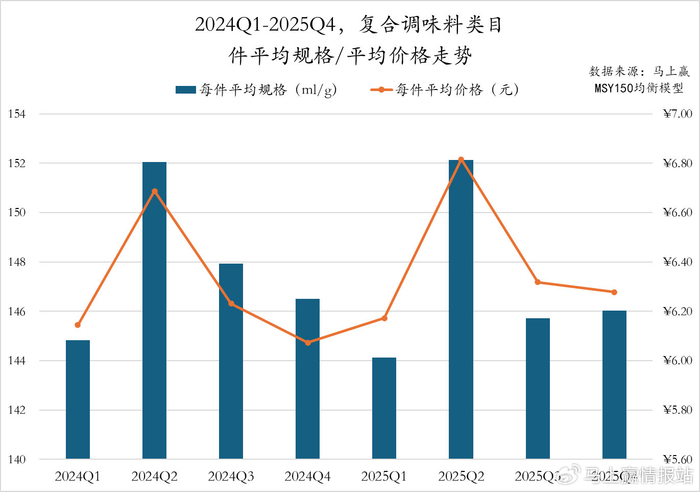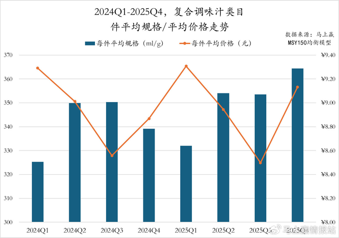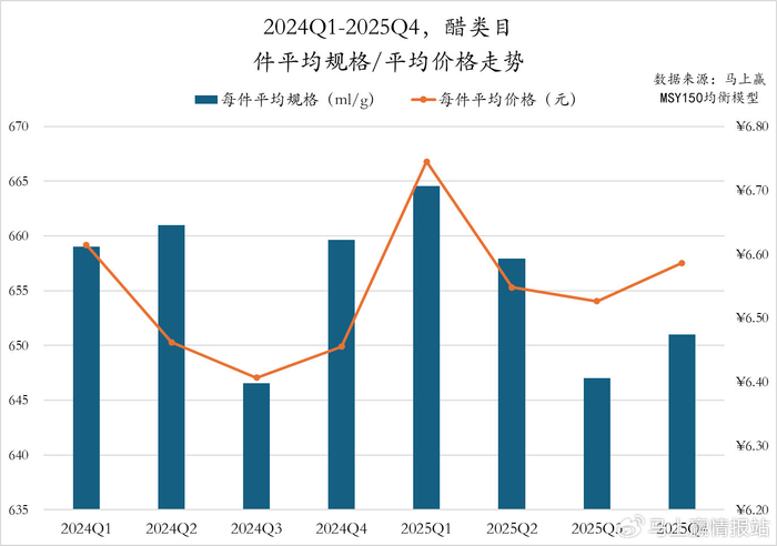 2024Q1至2025Q4,醋类目件均规格季节变化明显,两年的Q3均为年内件平均规格的低值,Q1、Q2则均为高值。值得注意的是,2025Q4同比2024Q4件均规格有着较为显著的下滑;每件平均规格上,2025年各季度的每件平均价格均高于2024年同期,或存在一定的价格上行趋势。