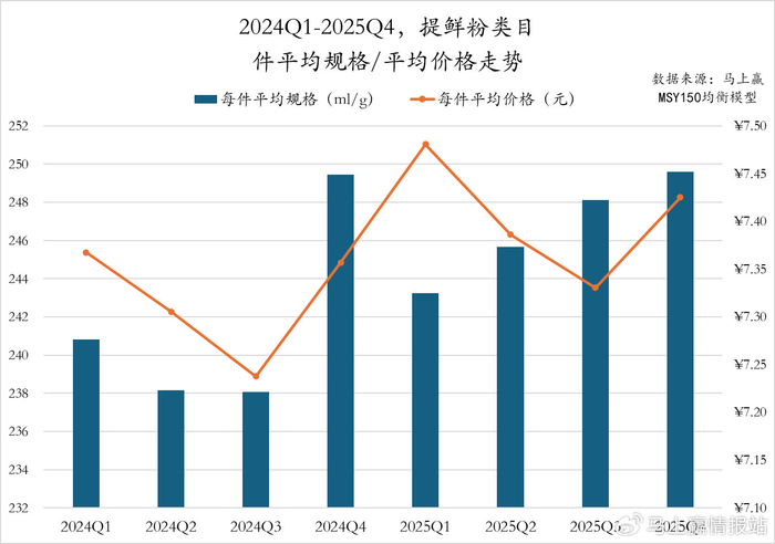 2024Q1至2025Q4,提鲜粉类目件均规格整体呈现增长趋势,其中2025Q4有着较为显著的波动;相比来说,件均价的波动上升趋势更为明显,2025年各季度件均价格均高于2024年同期件均价格。