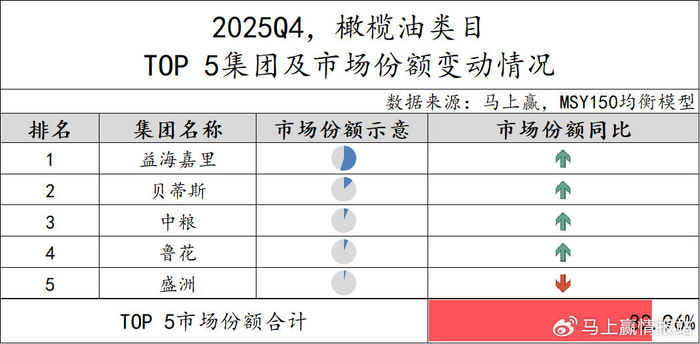 2025Q4,橄榄油类目TOP 5集团为益海嘉里、贝蒂斯、中粮、鲁花和盛洲,市场份额合计82.96%,是调味品市场中集中度较高的类目。其中,益海嘉里在占据过半市场份额的背景下,市场份额依然实现同比增长。除盛洲市场份额同比有所下滑外,其余集团同比均有所提升,橄榄油类目的集中度也或将进一步提升。