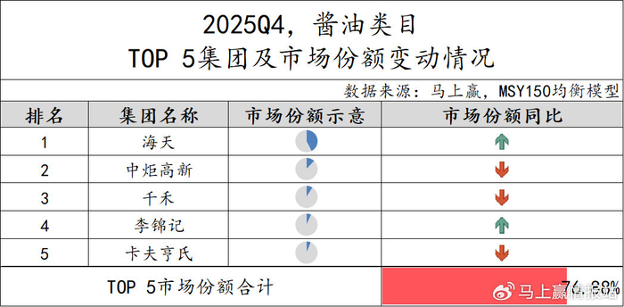 2025Q4,酱油类目TOP 5集团市场份额合计76.88%,市场集中度较高。从同比变化来看,海天集团市场份额约40%,位居第一的情况下依旧保持市场份额同比增长,李锦记市场份额也有所增长。中炬高新、千禾和卡夫亨氏市场份额则呈现同比下跌。