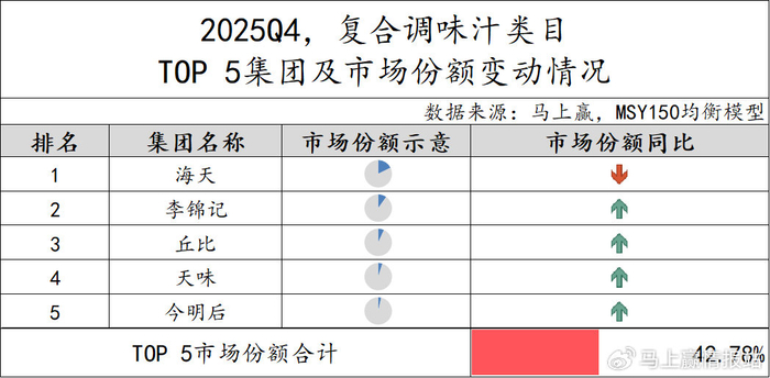 2025Q4,复合调味汁类目TOP 5集团组成有所变动,今明后集团代替鼎丰跻身第五,Top 5集团市场份额合计42.78%,市场集中度依旧较低。从市场份额同比变动来看,海天集团尽管占比高,但同比有所下降;其余四个集团市场份额均同比有所上升。
