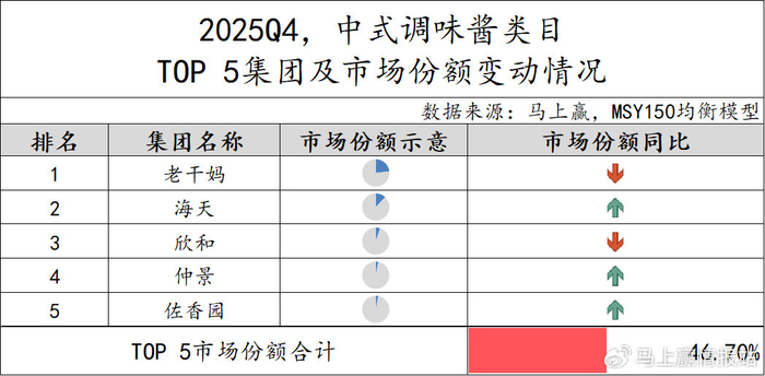 中式调味酱类目中,TOP 5集团市场份额合计46.70%,市场集中度较上一季度进一步下降(2025Q3 TOP5集团市场份额合计48.46%)。从市场份额同比变化来看,老干妈位列第一,但市场份额同比有所下降,欣和集团也同比下滑。而海天、仲景和佐香园市场份额同比提升。
