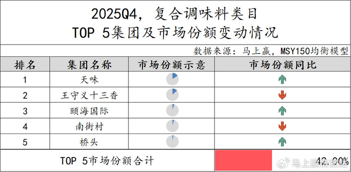 2025Q4,复合调味料类目TOP 5市场份额合计42%,市场集中度较上一季度有所提升但仍处于较低水平。从同比变化来看,天味、颐海国际和桥头集团市场份额同比提升,而王守义十三香和南街村则同比下滑。