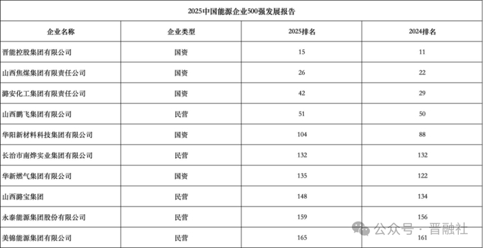 榜单中,省内排名前十的企业依次为:晋能控股集团(第15位)、山西焦煤集团(第26位)、潞安化工集团(第42位)、山西鹏飞集团(第51位)、华阳新材料科技集团(第104位)、长治市南烨实业集团(第132位)、华新燃气集团(第135位)、山西潞宝集团(第148位)、永泰能源集团(第159位)、美锦能源集团(第165位)。