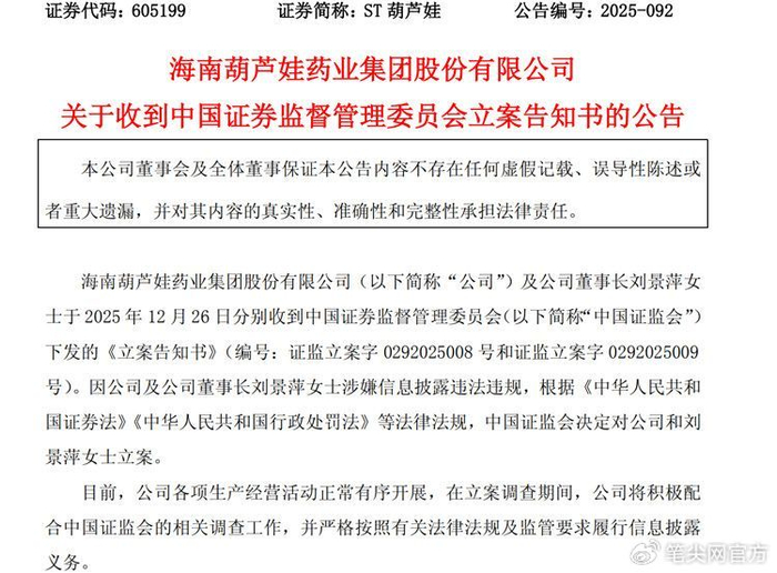 12月28日,ST葫芦娃发布公告称,公司及公司董事长刘景萍于 2025 年 12 月 26 日分别收到证监会下发的《立案告知书》。因公司及公司董事长刘景萍涉嫌信息披露违法违规,根据相关法律法规,证监会决定对公司和刘景萍立案。