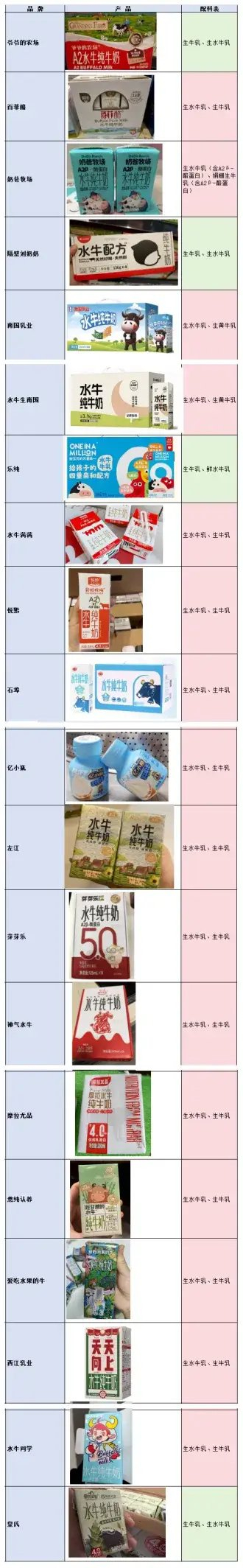 首当其冲的是“掺杂”问题。2025年9月,《新京报》联合第三方实验室的一纸报告,堪称行业地震:市面上20款同时标注“水牛”和“纯牛奶”的产品中,无一完全使用100%生水牛乳(生水牛乳是指刚挤出来未经任何处理的新鲜牛奶,需经高温灭菌和巴氏杀菌法处理后才能饮用),大多数产品都采取了“水牛乳+普通牛乳”的路子。