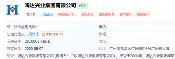 天眼查显示,鸿达兴业集团成立于2000年9月7日,注册资本为2.80亿元,法定代表人是周奕丰,股权结构为周奕丰持股72%、郑楚英持股28%,二人为夫妻关系。