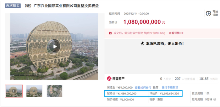 图片来源于阿里拍卖平台广州圆大厦的三次流拍,实则是鸿达兴业集团破产清算的具象化呈现。