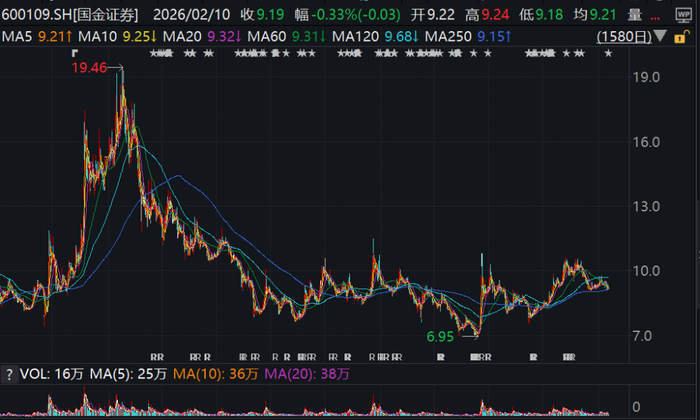 二级市场方面,自2020年12月2日上涨至19.46元高点之后,国金证券的股价再也没有达到此价位。截至2026年2月10日收盘,国金证券的股价报收于9.19元,市值约341亿元,较2020年12月2日的最高市值588亿元蒸发约247亿元。