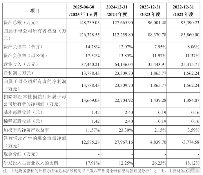 招股书显示,强一股份2022年、2023年、2024年营收分别为2.54亿元、3.54亿元、6.41亿元;净利分别为1562万元、1865.77万元、2.33亿元;扣非后净利分别为1384万元、1439万元、2.27亿元。