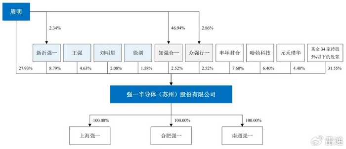 IPO后,周明持股为20.95%,新沂强一持股为6.59%,丰年君和持股为5.7%,华为旗下哈勃科技持股为4.8%,王强持股为3.47%,元禾璞华持股为3.3%,海风持股为2.32%,联发利宝持股为1.91%,知强合一、众强行一分别持股为1.89%,刘明星持股为1.56%;