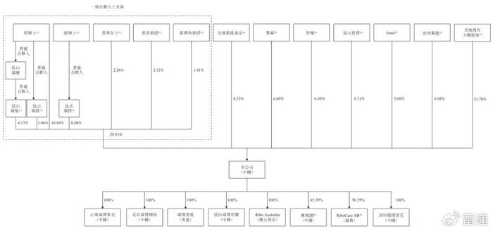 IPO后,梁子才博士及一致行动人一共控制24.82%股权,其中,梁子才博士持股为9%,昆山瑞控持股为6.71%,昆山瑞曼持股为3.42%,莫華女士持股为1.88%,席真教授持股为1.76%,張禮和教授持股为1.17%,昆山瑞技持股为0.88%。