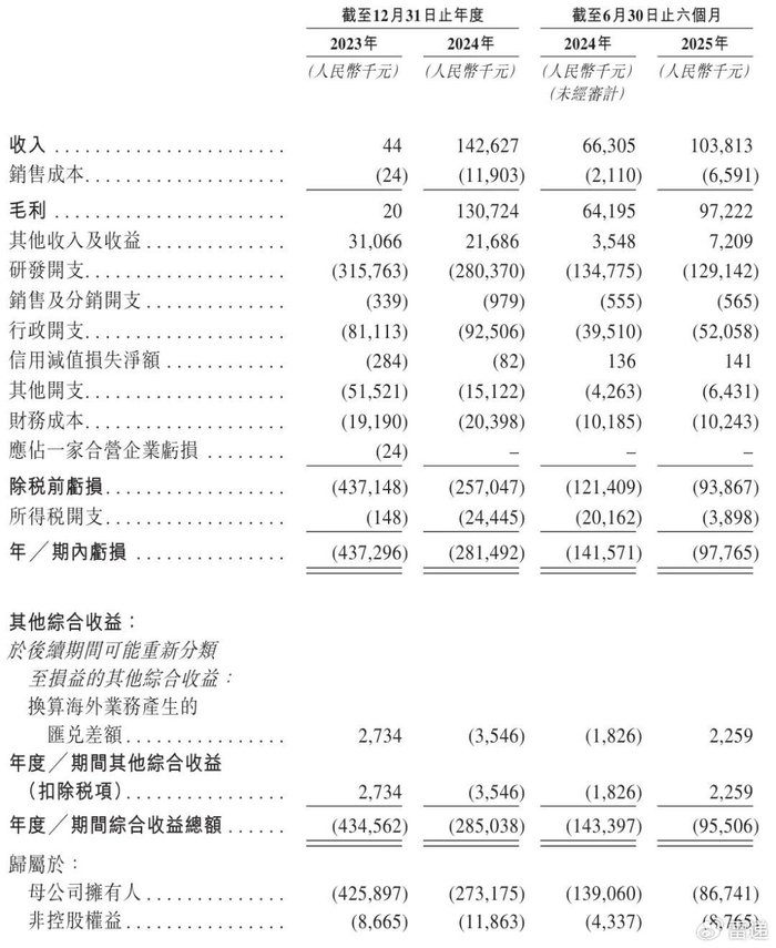 招股书显示,瑞博生物2023年、2024年营收分别为4.4万元、1.43亿元;毛利分别为2万元、1.31亿元;研发开支分别为3.16亿元、2.8亿元;行政开支分别为8111万元、9251万元;年亏损分别为4.37亿元、2.81亿元。