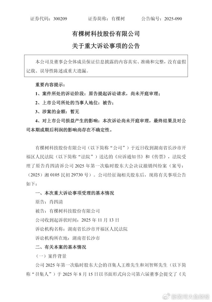 根据公告,有棵树于2025年11月13日收到湖南省长沙市开福区人民法院送达的《应诉通知书》和《传票》。原告为公司股东、前董事长肖四清,其就公司2025年第一次临时股东大会决议提起诉讼,请求法院撤销该决议,并要求公司承担案件受理费、保全费等全部诉讼费用。
