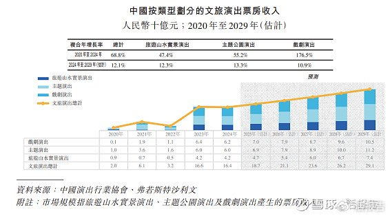 中国文旅演出市场规模正在快速增长。根据弗若斯特沙利文(Frost&Sullivan)的报告,以票房收入计,2024年中国文旅演出市场规模约人民币164亿元,2020年至2024年的复合年增长率约为68.8%。预计到2029年,文旅演出的票房收入将达到约人民币291亿元,2024年至2029年的复合年增长率约为12.1%。