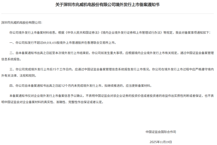 兆威机电于11月19日通过备案,拟发行不超过69,058,450股境外上市普通股并在香港联交所上市。公司备案耗时135天。