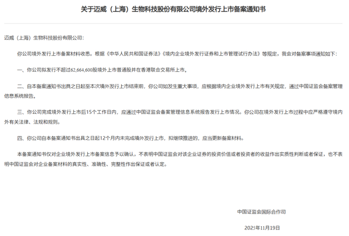 迈威生物-B于11月19日通过备案,拟发行不超过62,664,600股境外上市普通股并在香港联交所上市。公司备案耗时278天。