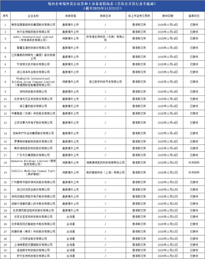 近期(2025年11月14日-11月21日)新增了有31家境内企业备案,其中友宝在线、第四范式、药捷安康、八马茶业、瑛泰医疗、连连数字和轩竹生物等七家已上市公司申请H股全流通,具体情况如下:
