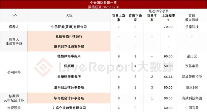 据LiveReport大数据统计,易点天下中介团队共计9家,其中保荐人1家,近10家保荐项目数据表现中规中矩;公司律师共计4家,综合项目数据表现普通。整体而言中介团队历史数据表现平平。