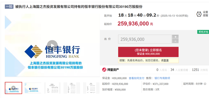 据了解,上海国之杰持有的3亿股恒丰银行股份,已由上海金融法院定于10月13日在司法拍卖平台公开处置,这也是该公司对恒丰银行股权的“清仓式”拍卖。