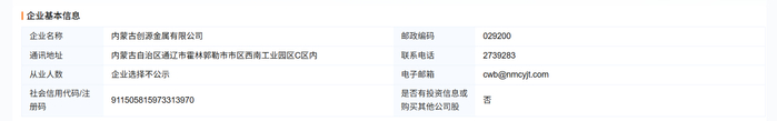 实控人崔立新控制的通辽智慧矿业,其2024年工商年报中的联系电话和邮箱,与创新实业旗下内蒙创源、创源新材料、创源物资再生、创源风电、创源智慧电能等5家子公司完全相同;子公司山东创源与其曾参股的新鹏铝基(该公司已于2024年7月注销),2023年工商年报使用的联系邮箱也完全一致。