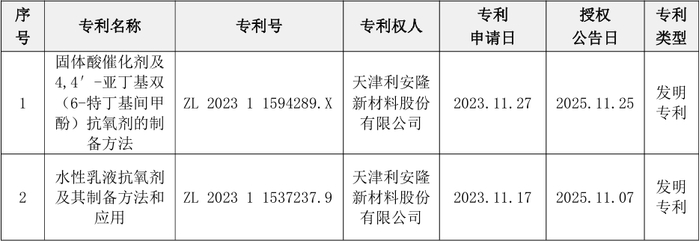 12月3日,利安隆(300596)发布公告,公司于2025年12月2日收到国家知识产权局颁发的两项发明专利证书,具体情况如下: