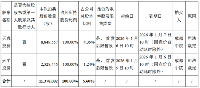 12月4日,迅游科技(300467)发布公告,厦门允能天成投资管理合伙企业(有限合伙)和厦门允能天宇投资管理合伙企业(有限合伙)合计所持1138万股将被司法拍卖,占其所持股份的100%及公司总股本的5.60%,具体如下: