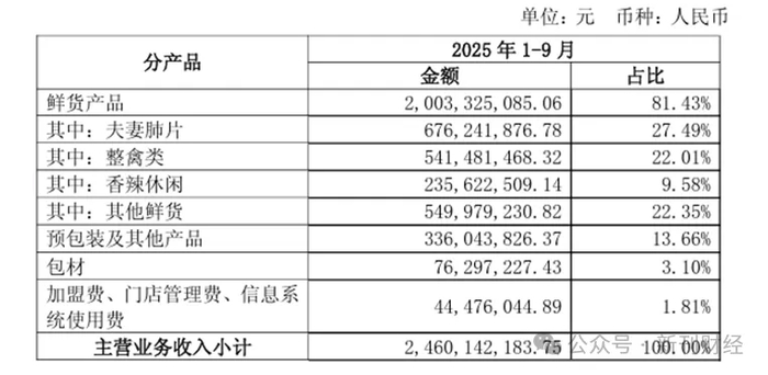 2025年前三季度,占营收大头的鲜货产品收入同比出现双位数下滑。其中,招牌产品“夫妻肺片”收入从上年同期的8.04亿元降至6.76亿元,同比下滑15.92%;整禽类产品收入从6.45亿元降至5.41亿元,同比下滑16.12%。