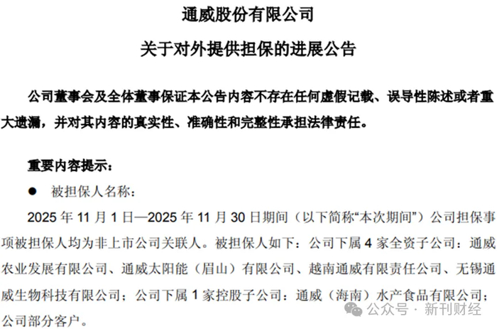 随着通威股份债务负担不断加重,内部担保作为通威股份及子公司获取新融资重要手段,也不断迎来新的公告。12月3日,通威股份再次公告了对外担保的进展:今年11月,公司及下属子公司相互提供担保金额达到了21.14亿元;截止11月底的担保实际余额为 456.89 亿元,反映出内部担保作为融资手段的长期价值,更深层次则是偿债压力巨大的通威股份,对获取新融资的迫切需求。