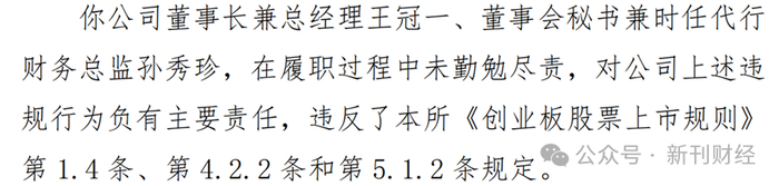 在这一系列违规行为的背后,离不开人的因素。监管函明确对公司董事长兼总经理王冠一、董事会秘书兼时任代行财务总监孙秀珍出具了警示函。