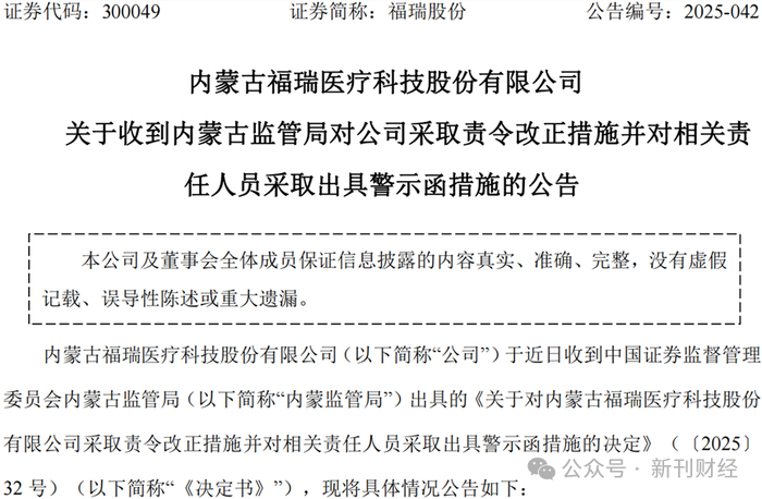 12月10日,对于内蒙古福瑞医疗科技股份有限公司(300049.SZ,简称“福瑞股份”)的投资者而言,注定是个难忘的冬日。这一天,深圳证券交易所与内蒙古证监局的监管函有如几记重锤,同时砸向了上市公司及其核心高管,也直接问责了会计师事务所的签字注册会计师。