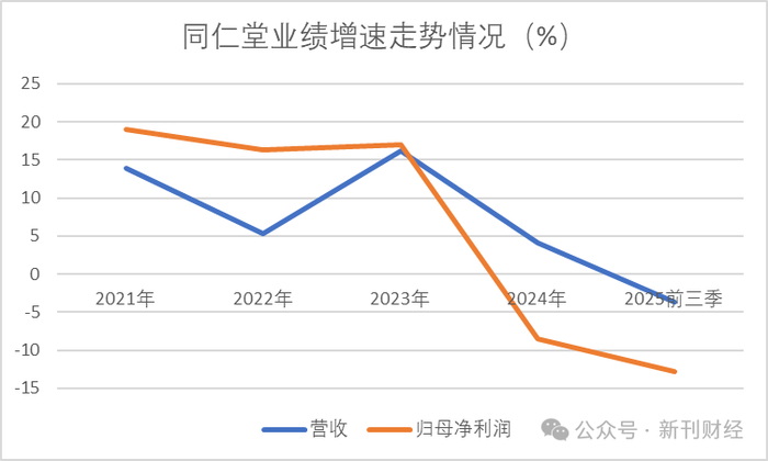 同仁堂最新的财务表现,同样传递出另一层面的压力信号。2025年三季报显示,公司经营业绩延续了自2024年以来的下滑态势。前三季度实现营业收入133.08亿元,同比下降3.70%;归母净利润为11.78亿元,同比下降12.78%。值得注意的是,公司在2024年已出现“增收不增利”的情况,营收微增但归母净利润同比下滑8.54%,为近五年来首次出现净利润负增长。