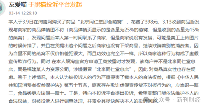 笔者发现,黑猫投诉[下载黑猫投诉客户端]平台上的数据同样令人担忧,截至12月15日,关于同仁堂产品的投诉量达254条,内容包括产品质量不符、成分标注不实等。其中有消费者投诉称,购买的祛痘产品实际含量与宣传不符;另有消费者发现,标注含有25%燕窝的产品实际含量仅为15%,而商家竟以“美工上传图片问题”为由搪塞。