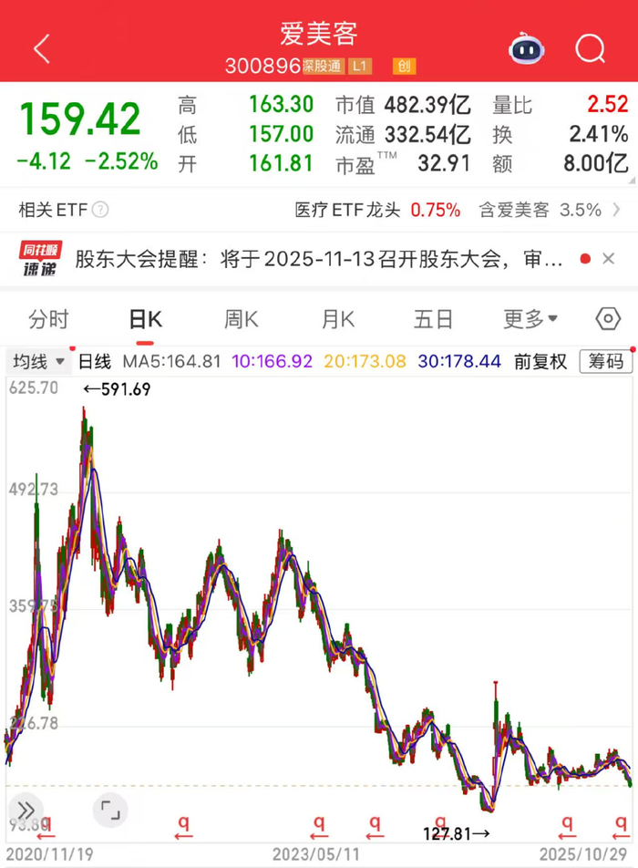 但随着业绩滑坡,爱美客股价开始“跌跌不休”。
