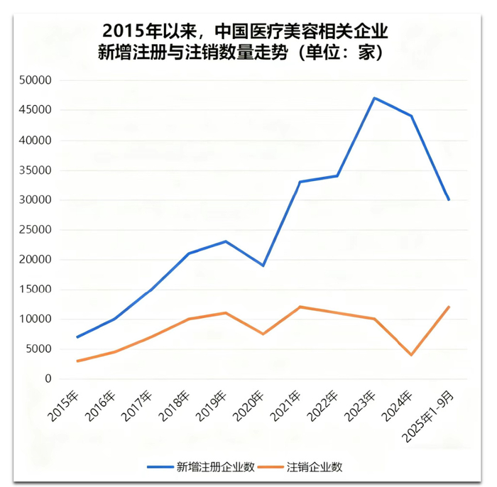医美行业观察发布的《2025医美行业上半年机构运营调研报告》显示,我国医美注册企业在2023年达到巅峰,一度超过47000家。