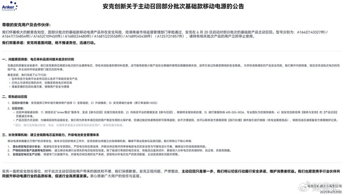 2025年的召回风暴更是愈演愈烈。6月,公司因供应商电芯问题,在中国市场召回32.53万件移动电源,涉及四款型号产品,召回原因是部分产品长时间使用可能出现隔膜绝缘失效,存在过热甚至燃烧风险;据市场披露,同期在海外部分市场同步启动相关产品召回,核心原因均指向供应商电芯质量问题。安克创新在公告中承认,此次问题源于电芯供应商擅自变更原材料,而这一关键质量隐患未能被其供应链管控体系及时发现。