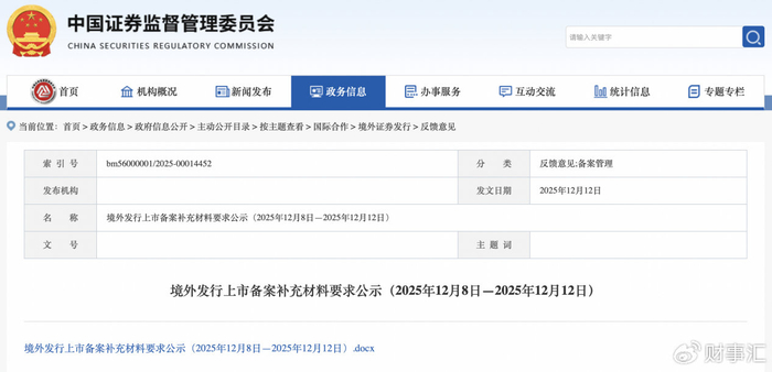 12月12日,中国证监会公布《境外发行上市备案补充材料要求(2025年12月8日—2025年12月12日)》,要求先为达港股IPO出具补充材料,就外资准入、新增股东入股价格合理性及股权激励合规性等事项补充说明。