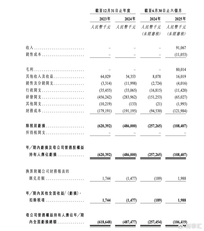 然而,高估值背后是严峻的财务现实。2023年、2024年及2025年上半年,先为达生物的营业收入分别为0元、0元及9106.7万元,而净亏损分别高达6.20亿元、4.86亿元和1.08亿元,累计亏损超12亿元。