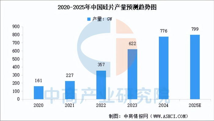 中国硅片产量增速均呈现放缓态势。中商产业研究院发布的《2025-2030中国光伏硅片市场现状研究分析与发展前景预测报告》显示,2024年中国硅片产量约776GW。中商产业研究院分析师预测,2025年中国硅片产量将达799GW。