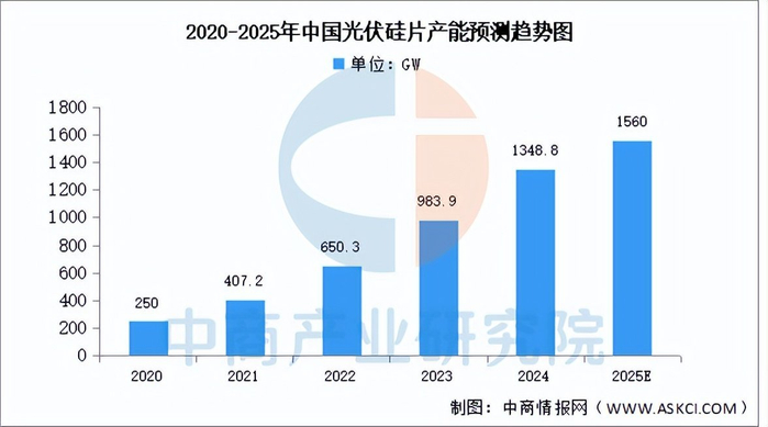 中商产业研究院发布的《2025-2030中国光伏硅片市场现状研究分析与发展前景预测报告》显示,我国大陆硅片产能约1348.8GW,同比增长41.4%,占全球硅片产能的96.7%。中商产业研究院分析师预测,2025年中国光伏硅片产能将超过1500GW。