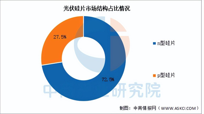 截至2024年底,n型硅片的市场占比已全面超越p型硅片,占比高达72.5%,而p型硅片的市场占比从2023年的74.5%下降至27.5%。