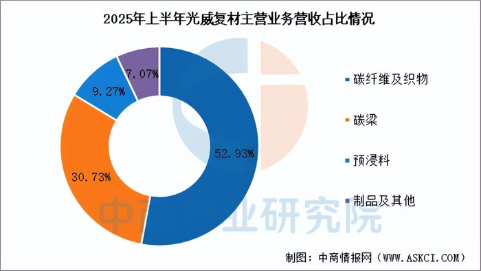 2025年前三季度,光威复材营业收入为19.86亿元,同比增长4.40%,归母净利润为4.15亿元,同比下降32.55%。2025年上半年主营产品包括碳纤维及织物、碳梁、预浸料、制品及其他,营收分别占整体的52.93%、30.73%、9.27%、7.07%。