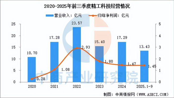 2025年前三季度,精工科技营业收入为13.43亿元,同比增长13.7%,归母净利润为1.45亿元,同比增长98.18%。2025年上半年主营产品中,碳纤维装备营收占整体的59.31%。