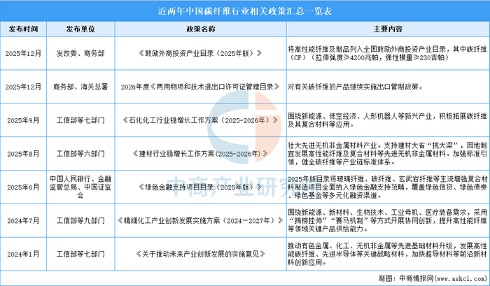 近年来,国家多部门密集出台政策支持碳纤维产业发展。如《鼓励外商投资产业目录(2025年版)》将高性能纤维及制品列入全国鼓励外商投资产业目录;《石化化工行业稳增长工作方案(2025-2026年)》围绕新能源、低空经济等新兴产业,积极拓展碳纤维及其复合材料等应用;《绿色金融支持项目目录(2025年版)》将碳纤维制造项目全面纳入绿色金融支持范畴;《关于推动未来产业创新发展的实施意见》明确发展高性能碳纤维等关键战略材料。同时,政策对相关产品继续实施出口管制,并致力于健全产业链标准体系、提升关键产品供给能力,为行业健康发展提供了有力的政策支持与引导。