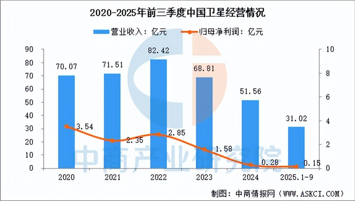 2025年前三季度,中国卫星营业收入为31.02亿元,同比增长85.28%,归母净利润为0.15亿元。2025年上半年主营产品是宇航制造及卫星应用,营收占整体的97.01%。