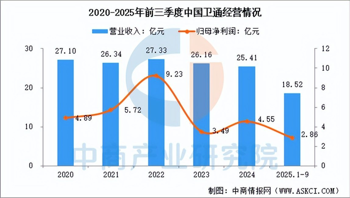2025年前三季度,中国卫通营业收入为18.52亿元,同比增长5.35%,归母净利润为2.86亿元,同比下降40.58%。主营业务是广播电视和卫星传输服务,2024年营收25.41亿元。