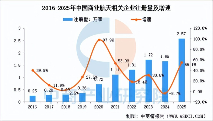 根据企查查数据,我国商业航天相关企业注册量呈增长趋势,从2016年至2025年,年均复合增长率约30%。2025年,新注册商业航天相关企业数为2.57家,同比增长55.1%,创历史新高。