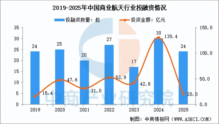 近年来,商业航天领域的投融资活跃。数据显示,2024年我国商业航天领域投融资数量达30起,投资金额达130.4亿元,达历史新高。2025年,投融资事件为24起,投资金额达20.0亿元。